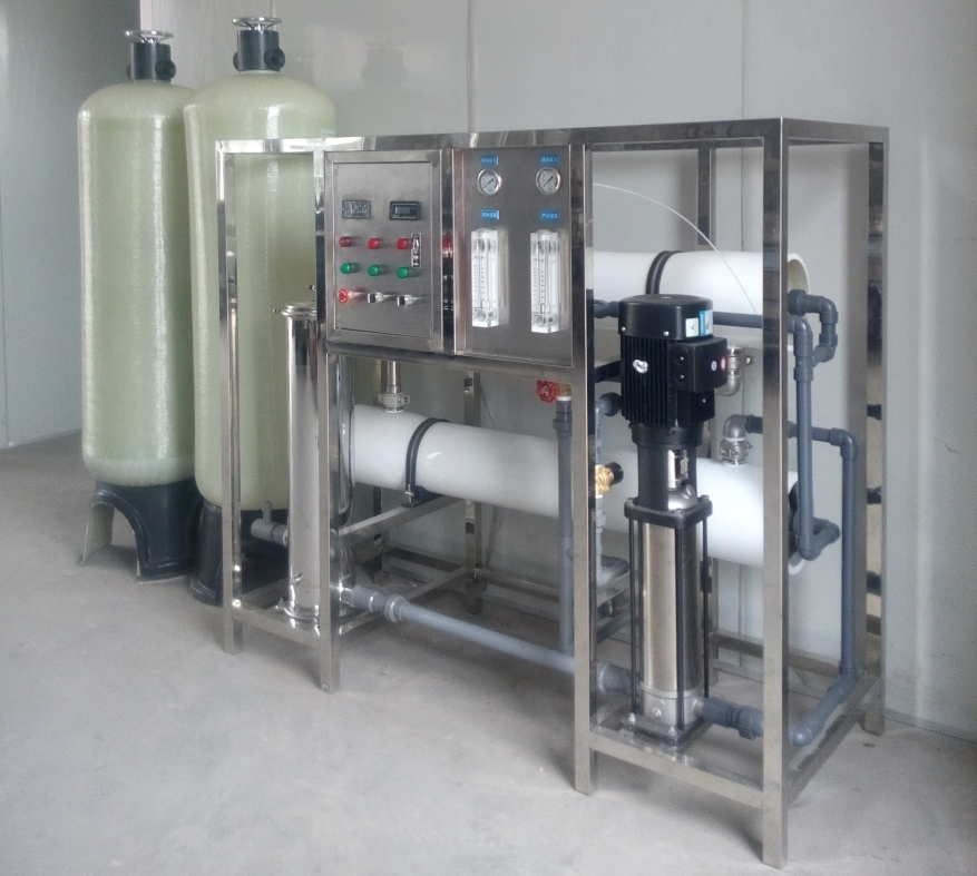 2吨反渗透设备是将原水经过精细石英砂过滤器、颗粒活性碳过滤器、精密过滤器等,再通过高压泵加压把水送到反渗透膜过滤,利用孔径为1/10000μm的反渗透膜(RO膜),使较高浓度的水变为低浓度水,同时将工业污染物、重金属、细菌、病毒等大量混入水中的杂质隔离,从而达到使用加工用水标准。
