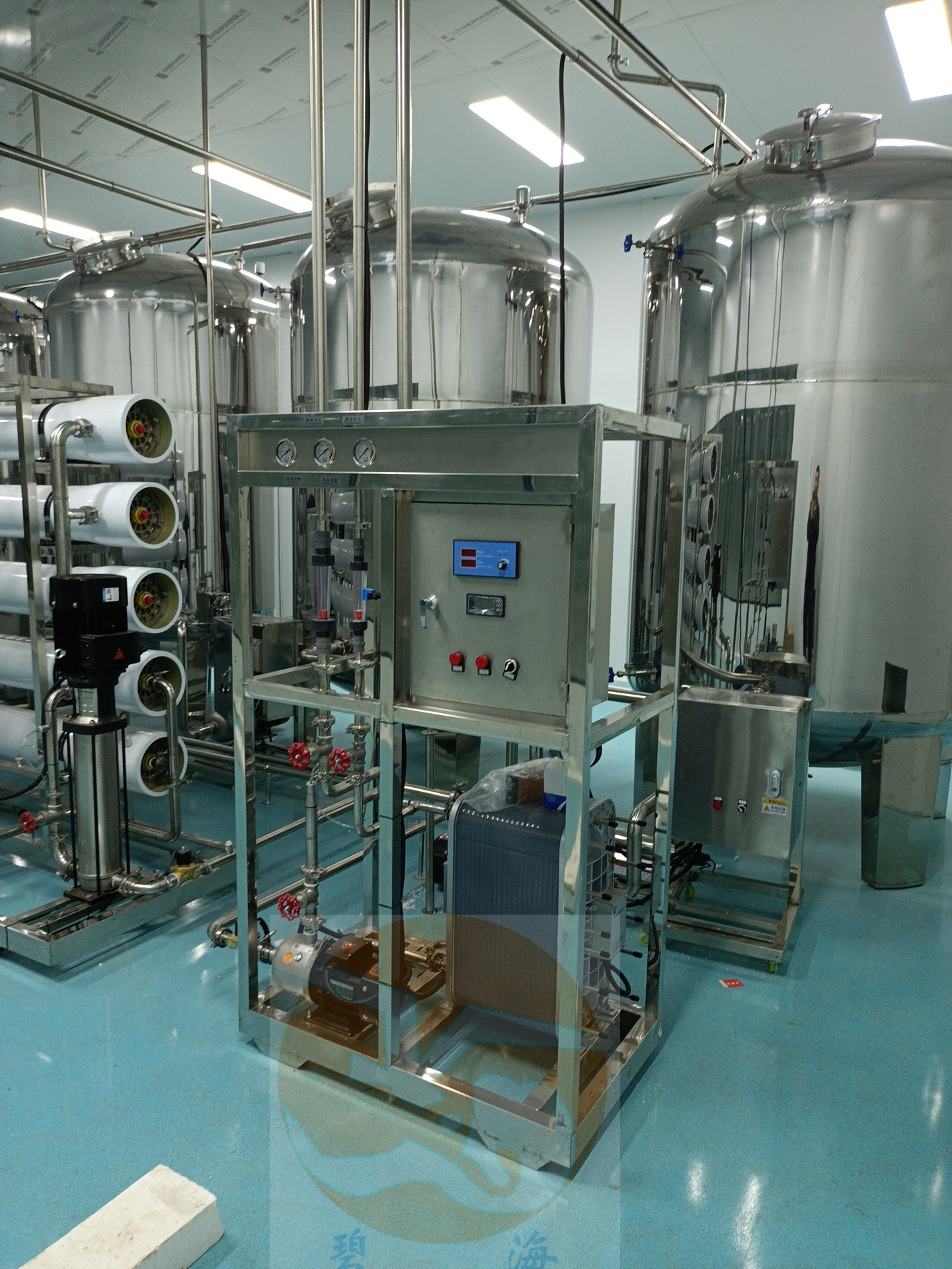 原水-原水加压泵→多介质过滤器→活性炭过滤器→软水器→精密过滤器→一级反渗透机→中间水箱→ 中间水泵→EDI系统→纯化水箱→纯水泵→紫外线杀菌器→微孔过滤器→用水点